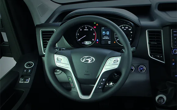 Nội thất của Hyundai Solati được thiết kế tối ưu, mang lại sự thoải mái cho cả người lái và hành khách. Ghế ngồi bọc da cao cấp, hệ thống điều hòa không khí tự động, và hệ thống giải trí đa phương tiện hiện đại giúp hành trình trở nên dễ chịu và thú vị hơn. Bảng điều khiển trung tâm hiển thị các thông tin và tình trạng của xe một cách rõ ràng, kết hợp vô lăng trợ lực điện, điều chỉnh theo vị trí lái, tích hợp phím chức năng giúp tăng sự thuận tiện và an toàn cho người lái.